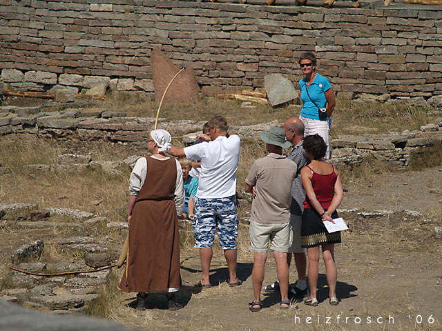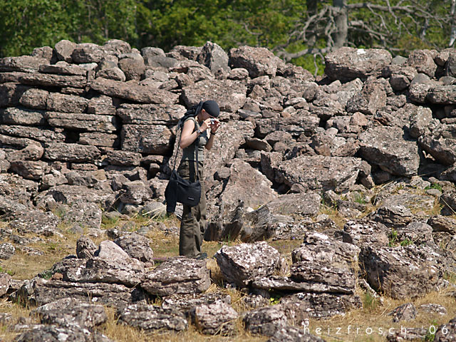 Um 8.00 Uhr klingelt der Wecker, bis 10.00 Uhr dauern Frühstück und das Auftragen von Sonnenschutzcreme. Dann gehts ab ins Auto. Bis Kalmar brauchen wir ungefähr eine dreiviertel Stunde, und 10 Minuten später sind wir schon auf der Insel. Wir hangeln uns immer an der Westküste entlang bis fast an die Südspitze der Insel. Dort suchen wir verzweifelt die Abfahrt nach Eketorp, einer wiederaufgebauten Rundburg mit Mittelalterdorf. Kurz vorm Aufgeben taucht dann doch noch der entscheidende Wegweiser nach links auf ... Wir verbringen 3 Stunden in, auf und um die Burg herum, machen eine kleine Führung mit und haben jede Menge Spaß.
