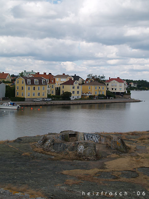 Dann gehts weiter über die Amiralitetsgatan zum Chapmansplan, wo viele alte Häuser zwischen neuen stehen. Unterwegs habe ich durch einen Hafeneingang sogar eines der schwedischen Stealth-Schiff gesehen, aber dort die Kamera hochzureißen und abzudrücken war mir dann doch zu heikel. Auf dem Stakholmen, einem Felsen im Wasser mit alten Bunkerresten und vielen Sitzbänken, machen wir eine Pause. Dann latschen wir weiter über den Fisktorget und die Ronnebygatan, wo wir gleich noch passende Bettlaken fürs Häuschen kaufen.