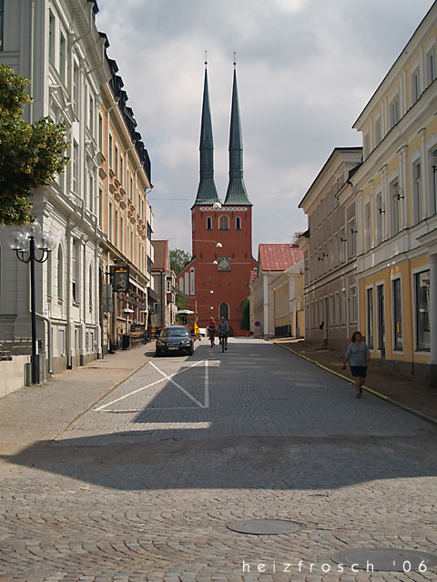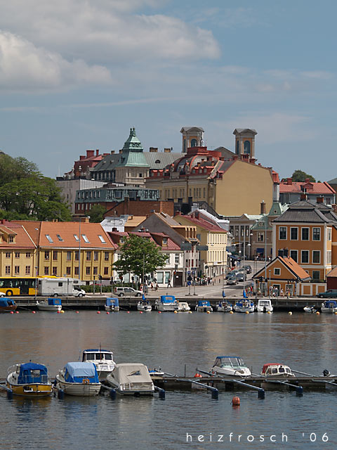 Über die Länsstyrelsen gelangen wir zur Insel Stumholmen, wo sich das Marinmuseum, alte Festungsanlagen und Kasernen befinden. Das Museum lassen wir aber sein, schauen uns nur flink ein paar alte Kriegsschiffe an, drehen eine Runde um die Insel und latschen dann noch über den Kungsbron zur Amiralitetskyrkan, eine alte Holzkirche. Die Vorfreude aufs Eis wird jetzt immer größer. Deshalb treten wir langsam den Rückweg über die Drottninggatan und Kyrkogatan zur Eisdiele an – wo ca. 30 Leute in der Warteschlange stehen und einfach kein Vorwärtskommen zu bemerken ist. Mist! Aber was sollst, Eis gibts auch anderswo, deshalb Abbruch, zurück ans Auto und ab nach Hause. Reine Zeit für Stadttour waren übrigens ca. 4 Stunden.