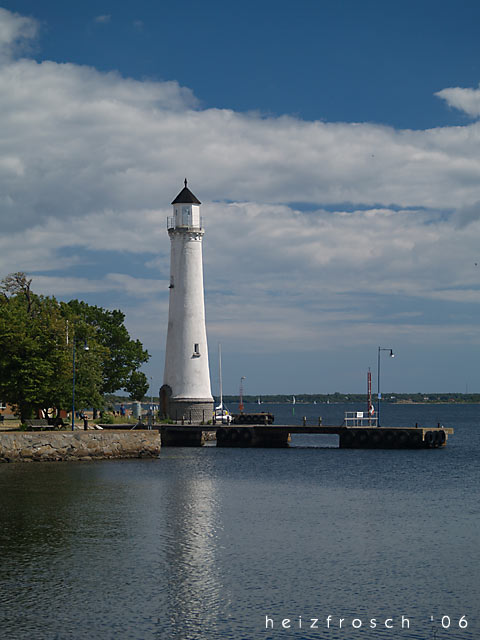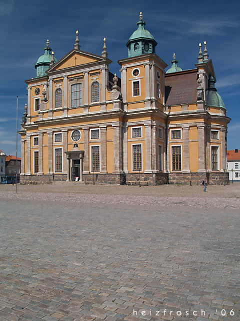 Karlskrona (Stadtkarte als PDF) ist eine Festungsstadt und dient auch heute noch der Marine als Stützpunkt. Augen aufklappen, über Sonne freuen, frühstücken, einschmieren – business as usual. Und los gehts. Über die Norra Kungsgatan fallen wir in die Stadt ein, finden auf dem Norra Smedjeg ein günstiges Parkhaus mitten in der Stadt (ein Tag für 40 Kronen, also ca. 4 EUR!). Von dort gehts erstmal direkt zur Touri-Info an der Ecke Södra Smedjeg/Kyrkogatan. Nebenan gibts ganz lecker Eis, und wir planen das fürs Ende der Tour. Aber erstmal besuchen wir am Stortorget die Frederikskyrkan und in die Trefaldighetskyrkan. Dann wandern wir südlich durch den Park auf der Södra Kungsgatan zum Klockstapel, einem Glockenturm, der angeblich dem Leuchtturm von Alexandria nachempfunden wurde. Naja ... Damals war die Phantasie noch größer.