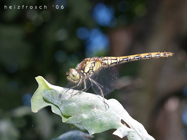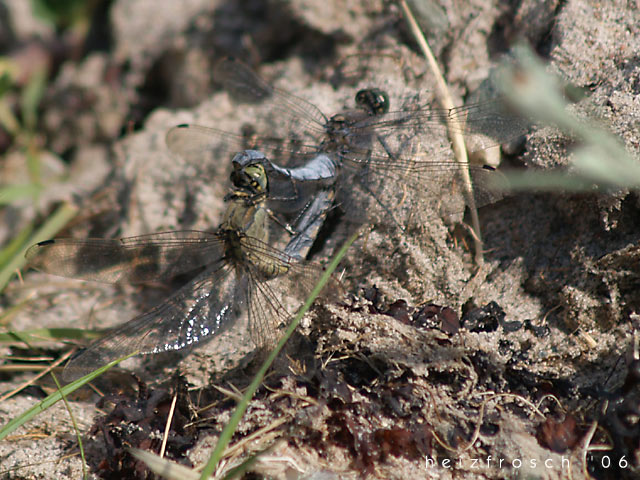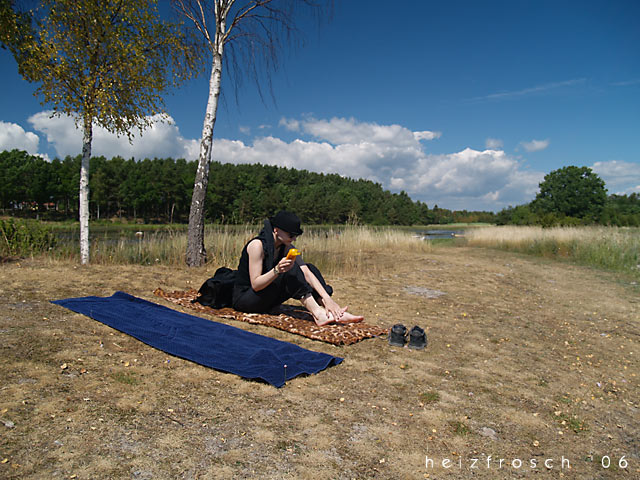 Wieder geniales Wetter! Wir haben keinen Bock auf eine lange Autofahrt in brüllender Hitze, deshalb suchen wir zu Fuß die nähere Umgebung des Häuschens nach einem ruhigem Strandstück ab. Nach ein paar Abstechern in diverse Sackgassen finden wir eine leidlich passende Stelle mit viel Liegefläche; später sind ein paar Einheimische sichtlich sauer auf uns – hej, dann steht gefälligst eher auf! :) Und Platz wäre eh genug gewesen ... Es wird gelesen, MasterMind gespielt, ich fotografiere ein paar (u.a. kopulierende) Libellen und hole mir wegen eines kleinen Aussetzers beim LSF20-Auftrag einen Sonnenbrand an den Waden. Am frühen Nachmittag treten wir den Rückmarsch and und faulenzen den Rest des Tages vor der Hütte.