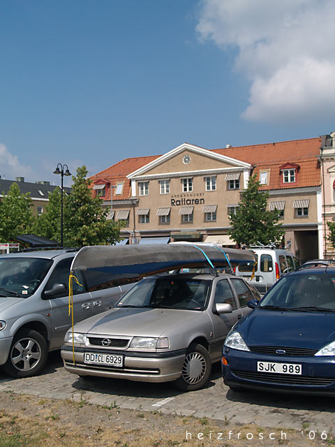 Auf dem Parkplatz in der Nähe des Doms steht: ein Dresdner! Und noch dazu mit einem uralten DDR-Standardfaltboot auf dem Dach (Poucher RZ 58, wenn ich mich nicht täusche; mit sowas sind wir vor 30 Jahren durch die Masuren geschippert ...).