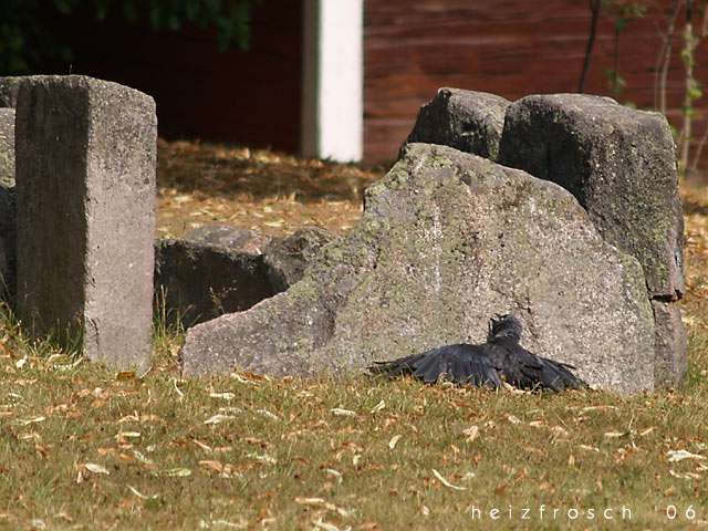 Danach besuchen wir das Smålands Museum. Auf der Wiese vor dem Museum sehen wir einen Vogel im Gebet – oder beim Trocknen, keine Ahnung ... Die obere Etage besteht aus einem reichlich wirren Sammelsurium aus Frühgeschichte, Ausstellung zum großen Sturm im Januar 2005 und einer Gemäldesammlung. Die untere Etage dagegen ist der Hammer: Dort steht eine interessante Glasausstellung mit z.T. traumhaft schönen Exponaten; z.B. liegen 1,5 m lange Krabbenbeine herum – komplett aus tiefrotem bis fast schwarzem Glas! Das macht Appetit auf mehr. Deshalb begeben wir uns wieder auf die Landstraße und kaufen noch flink in einem der Glas-Fabrikverkäufe zwei Eintrittskarten für die Glashüttentour nächste Woche.
