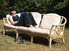 Faulenztag – geniales Wetter zum Terassenliegen und Lesen. Frau R. grillt auf dem Sofa in der Rasenmitte, und ich verfolge Libellen.